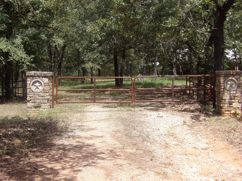 Elm Creek, an all-weather creek, runs through the western part of the property and tumbles over a beautiful 25+ ft waterfall known as Elm Falls and then meanders around by a limestone cave. A cliff features huge granite boulder outcroppings and overlooks the creek near the home. Approximately 3/4 mile of county road frontage along Boggy Depot Rd.