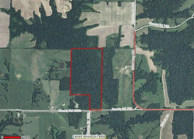 72 acres located near Wellsville in Audrain Co. Solid timber with gravel road frontage. Property near Marshall Diggs Wildlife Area. Asking $1950/acre.