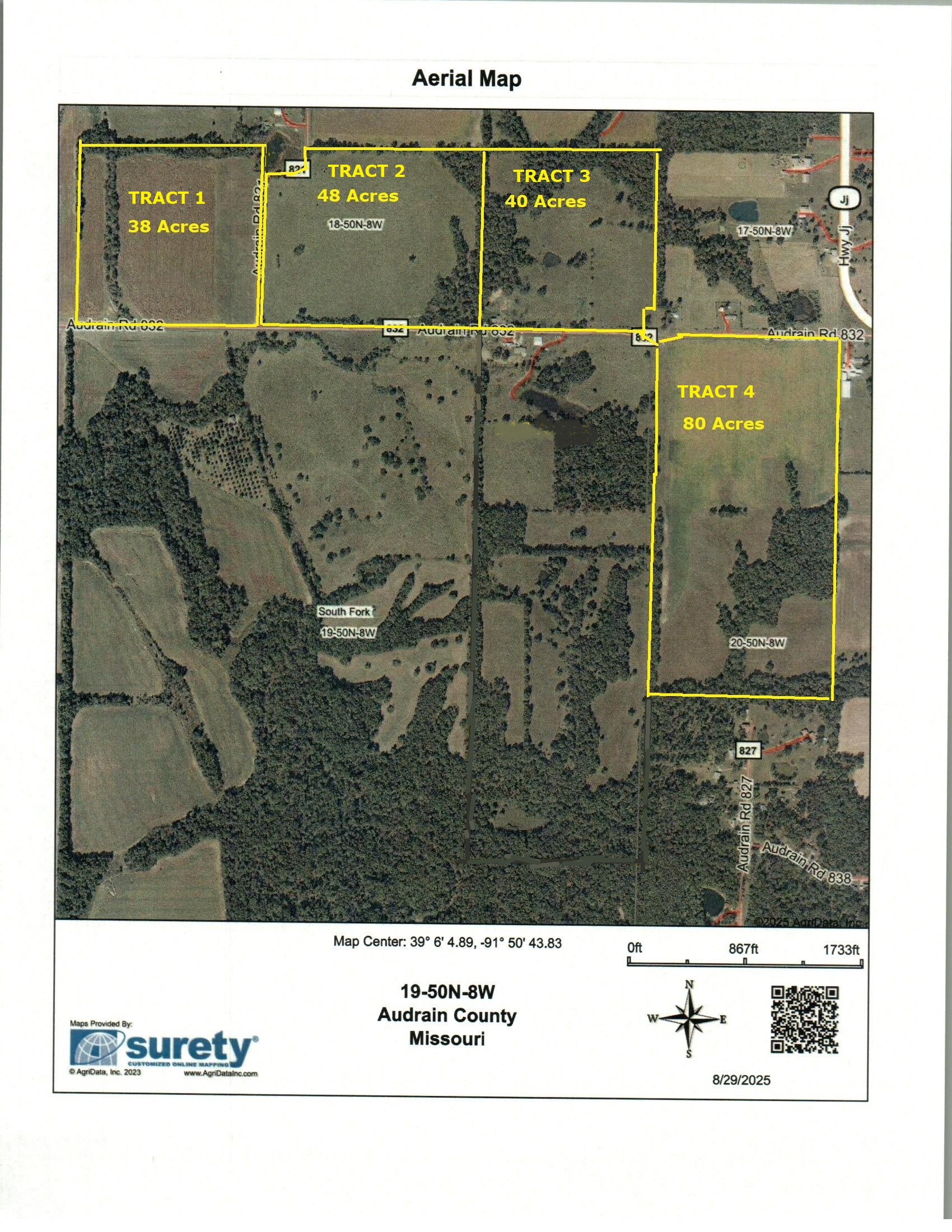 206 +/- Acres in Township 50N, Range 8W, Sections 18 and 20 in Audrain County, Missouri. Property will be offered in 4 tracts ranging from 38+/- acres to 80 +/- acres, all with individual direct access from Audrain County Road 832.