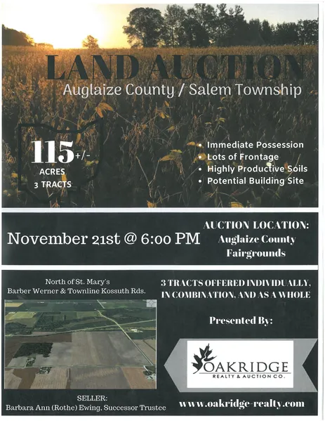 NOVEMBER 21st at the Auglaize County jr. Fair Building. 6 PM Sharp!! High Quality farm in Section 1 of Salem Twp., Auglaize County Ohio. Great Location just north of St. Mary's of State Route 66. The farm has two frontages on Barber Werner Rd., and Townline Kossuth. Auction Terms, FSA information, and soil data coming soon.