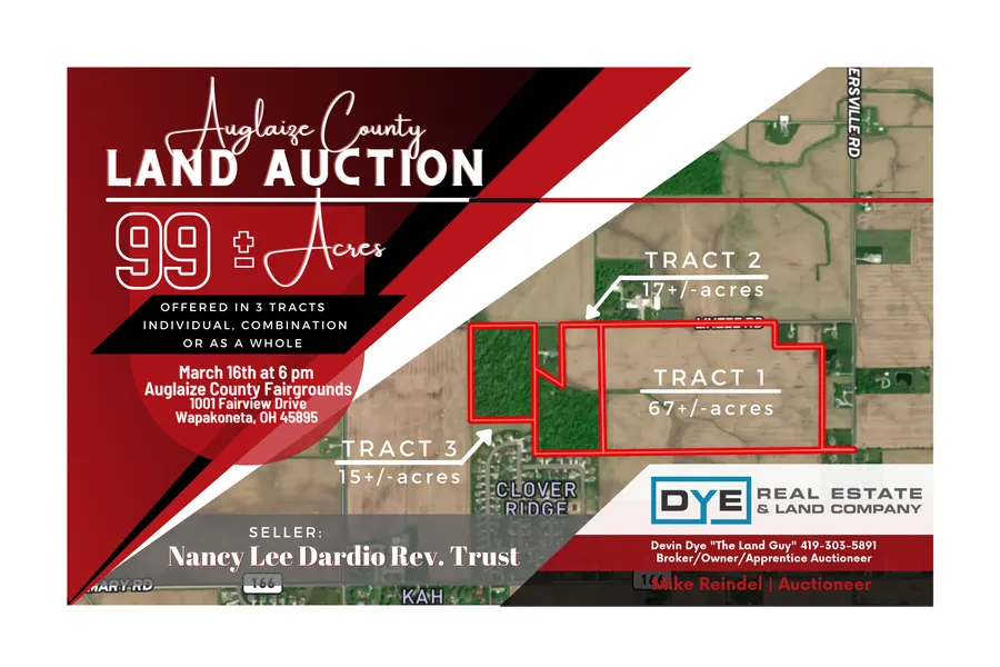 LAND AUCTION! 99 +/- ACRES IN DUCHOUQUET TWP, AUGLAIZE COUNTY, OHIO OFFERED IN 3 TRACTS (INDIVIDUALLY, COMBINATION OR AS A WHOLE)