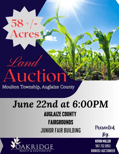 PUBLIC AUCTION of 58 +/- Acres - JUNE 22ND - 6 PM SHARP! Auglaize County Jr. Fair Building