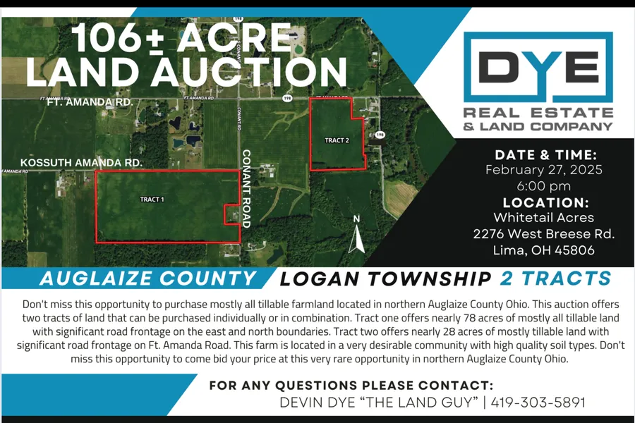 Dont miss this opportunity to purchase mostly all tillable farmland located in northern Auglaize County Ohio. This auction offers two tracts of land that can be purchased individually or in combination. Tract one offers nearly 78 acres of mostly all tillable land with significant road frontage on the east and north boundaries. Tract two offers nearly 28 acres of mostly tillable land with significant road frontage on Ft. Amanda Road. This farm is located in a very desirable community with high quality soil types. Dont miss this opportunity to come bid your price at this very rare opportunity in northern Auglaize County Ohio.