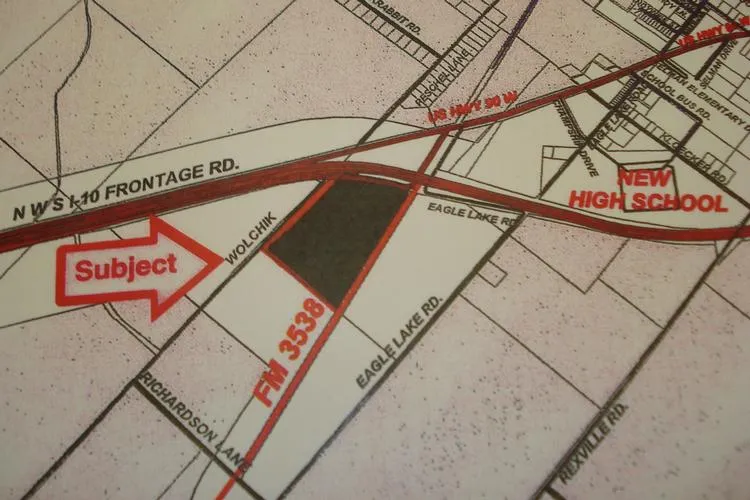 PRICE REDUCED!!! Excellent Commercial Property available located adjacent south of I-10 and adjacent west of FM 3538 in Sealy, Texas. Boasting an impressive 4,880. total feet of road frontage, this 54.5942 acre tract is every developers dream with road frontage on THREE sides: I-10 at Exit #718 with 1,311. feet on frontage road, FM 3538 with 2,153. feet & Wolchik road with 1,416. feet. It has perimeter fencing and one small pond. Located within the Sealy city limits, the commercial possibilities are endless on this track of land. The property may be divided in tracts of 15.0 acres, 25.0 acres or as agreed by all parties. The Sellers are negotiable on price and number of acres.