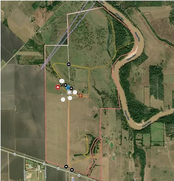The highway pastures on the southern half of the ranch are mostly flat at 125 above sea level. The river pastures on the north half slope slightly toward the river from 100 above sea level to -75 above sea level in the river bed. Approximately 500 acres is in 100 yr flood plain.
