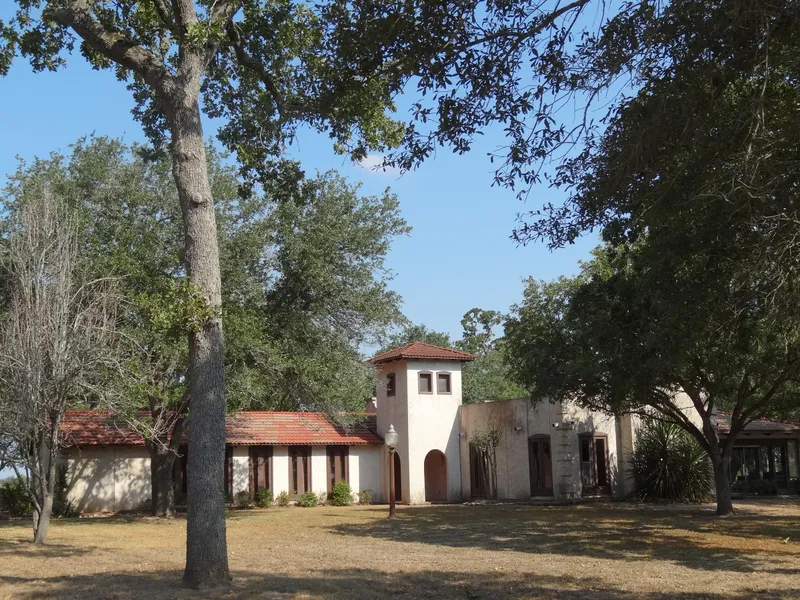 The front entrance gate to the ranch is framed on either side by long stone walls which were repurposed from the historic 1900s Railroad Roundhouse that had been located in Bellville, Texas, just a few miles away (the Gulf, Colorado and Santa Fe Railway division headquarters moved to Bellville at the turn of the last century). Mature agave and lively oak trees greet you along the mile entrance drive, formally named Hope Road. Your private road, ideal for a leisurely evening stroll or morning jog, leads to the Spanish-style main house and stabled main barn of the property.