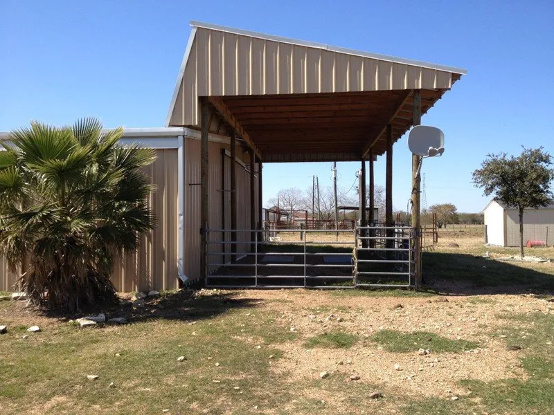 Metal horse barn with stalls, turn-out paddocks, tack room