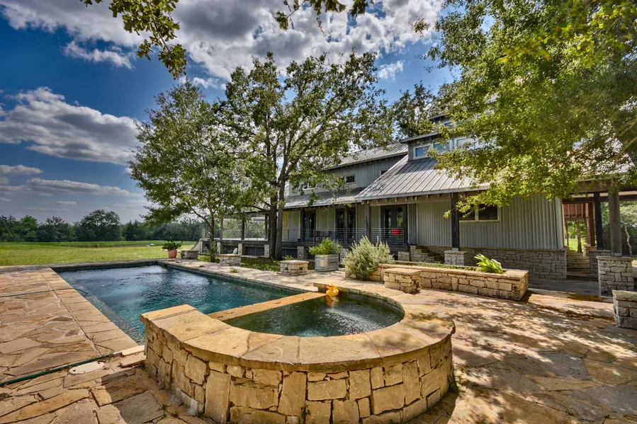 The Ranch features a unique 2,388 sqft 3b/3b custom built 2 story Farm House nestled in a nice meadow at the rear of the property overlooking a beautiful pond stocked with bass. As you enter the main home you will notice the low maintenance galvanized and limestone exterior with 2,664 sqft of porches to take in all the views, and a custom pool built up on a limestone foundation for those hot summer days. Inside you will find a open floor plan with Vaulted ceilings, exposed trusses, limestone fireplace, wood floors and double kitchens for entertaining. The galvanized staircase will take you upstairs to the 3 bedrooms and 2 bathrooms, the master bedroom has many windows that gives you the feeling of being ou...