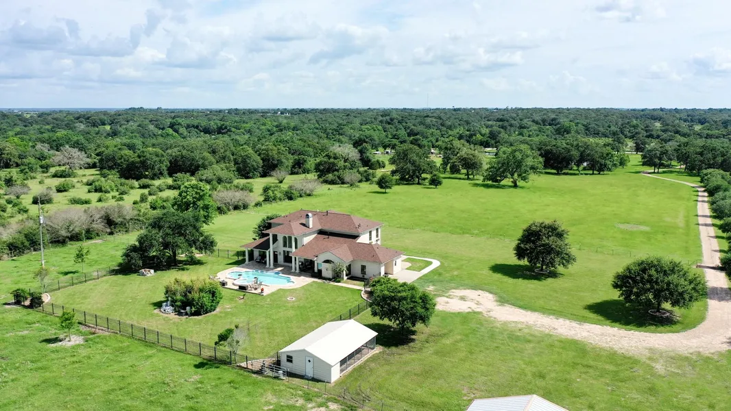 Luxury Tuscan-style home on a lush -/+ 18 acres, conveniently located just minutes away from the desirable little town of Bellville, less than 30 minutes drive time to Hwy 99/Grand Pkwy. This custom built home boasts masculinity with it's 30' ceilings and grand entrance. Meticulous detail from top to bottom, from the sought after concrete flooring, to the open and airy kitchen with the abundance of oversized windows for all your viewing pleasure. With over 4000sqft of living space this home was designed with entertaining in mind, multiple fireplaces, formal dining & living, wrap around wet bar and so much more! Make your way outside to your own outdoor oasis, overlooking the amazing views this country setting has to offer with multi level decking, a glamorous pool/spa and covered travertine porches. Cattle and equestrian ready, this property offers both cross and perimeter fencing. Healthy stocked pond with dock and an abundance of wildlife. Your recreational haven awaits!