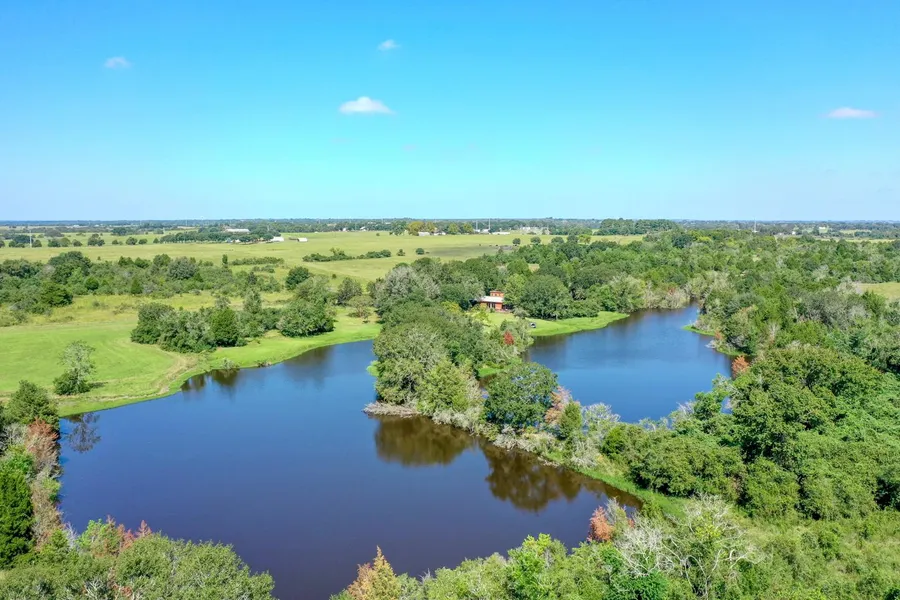 This -/+ 128 acre ranch features breathtaking panoramic views of Austin County, both rolling and level terrain, lush fertilized landscape, mixed soil surfaces, multiple tree types and an abundance of wildlife. This AG exempt property is sure to suit any ranchers needs, with its fully fenced perimeter, its ideal for livestock and currently in hay production. The main home offers 1 bedroom, 1 bathroom and a half bath, with the guest cottage offering 1 bedroom and 1 bathroom, along with numerous utility barns and a large garage/shop with additional storage. While the structures are being sold AS IS, there is so much potential for the new owners to create their own vision for this country retreat. Multiple stocked ponds, one spanning an acre and a half with a large fishing pier, soak in the spectacular views sitting on the deck, or bring your home plans to build on top of the hill overlooki...