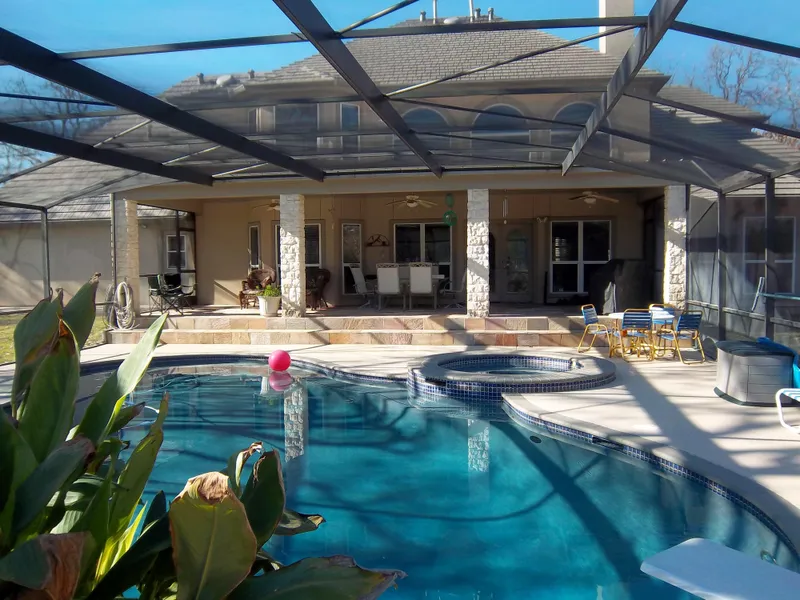 As you exit the back of the home you enter into an outdoor paradise complete with enclosed 32,000 gallon saltwater pool with waterfall, spa and diving board. A picture perfect area with with plenty of room for entertaining or endless private family fun. This pool is very low maintenance as the cover surrounding the pool area keeps it free from leaves and other blowing debris. Controlled with a very convenient digital panel located just inside the door into the LR.