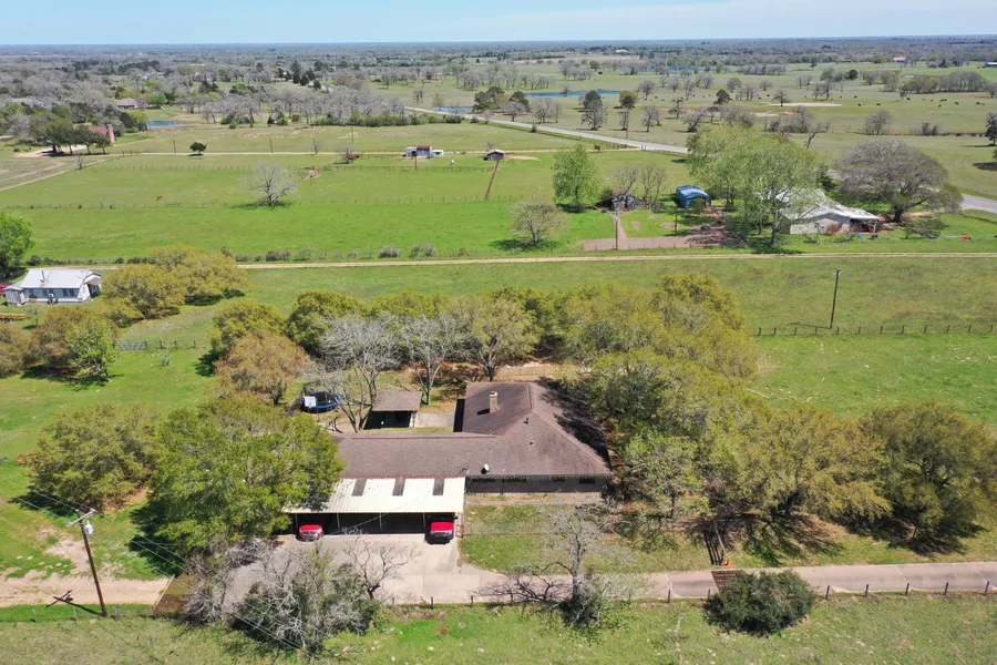 Ranch style home on 9 acres just a mile from the Bellville city limits. Over 2,600 square feet of living space accessed by concrete drive lined with mature live oak trees, secured behind and automatic gate. 5BR, 2.5B, 6 bays of vehicle storage, well fence yard and perimeter fence. Numerous storage buildings including a 27X75 shop, smoke house, livestock working pen, and yes, a pond. Pretty well everything you look for in a country property, even agricultural valuation on much of the acreage.