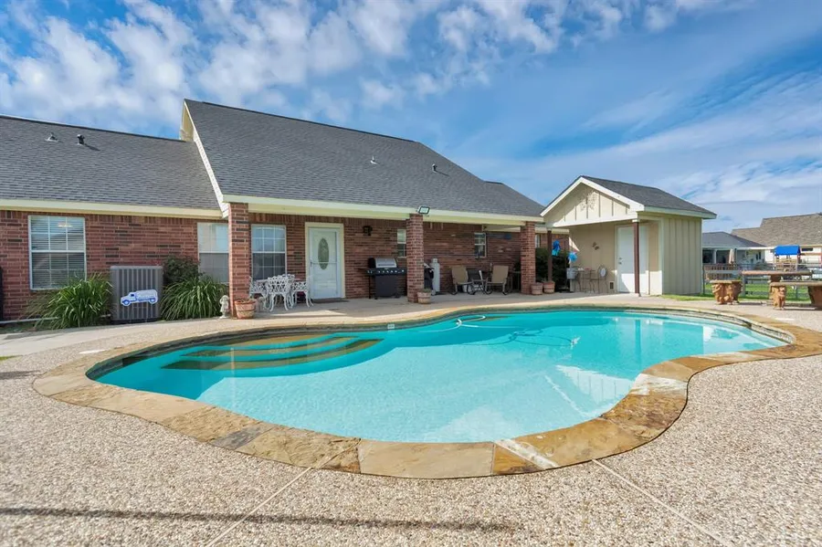 This amazing home & property will go FAST! It truly has it all: acreage, home, private pool & additional buildings! It features 4 bedrooms,2.5 bathrooms ,pool, outdoor bathing house, outdoor entertaining area & detached two car garage.Tile flooring guides you throughout the home w/wood flooring in all the bedrooms .Family room is open & spacious.Kitchen features custom cabinetry, lots of counter space & large open space. Primary Suite w/ its large windows fill this retreat with natural light & the primary bathroom features double sink, jacuzzi tub & separate shower.The three secondary bedrooms & bathroom are nicely sized. The detached garage has extra space for you to store your golf cart and/or ATV.Step into the back yard to your outdoor living area complete with a 1+ acre lot, awesome pool to cool off in & pool house with a shower & a bath.Step over to the large covered-patio ready to unwind with family & friends or use the space to setup your outdoor kitchen.