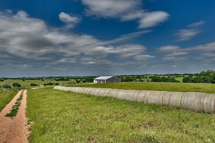 IMPROVED PRICE! 2022 Custom Barndo set amid the rolling hills of New Ulm, TX! This property has all the bells & whistles you want in a home with approximately 2500 SF of living space, plus an approximate 1250 SF (25 X 50) of shop space with three roll up doors w/plenty of room for your Texas size truck & trailer w/bonus 1/2 bath, beautiful views of the rolling hills & starry nights. Modern farmhouse home features a gorgeous country kitchen w/butcher block countertop, seating of 6 at eat at island (quartz countertop on the island), soft close cabinetry, GE appliances, large pantry and open to the living room. Soaring 21' ceilings in the living room welcome you to unwind & relax while feeling open & airy. Split plan features a private primary rm w/modern ensuite - you will love the lg shower, soaking tub & spacious closet. 3 additional bedrooms, 3 full bathrooms in the home and a 1/2 bath in the shop! Utility room is conveniently located near the center of the home. 10.17 acres, Pond, 3 Pastures for your livestock & perimeter field fencing. The panoramic views surrounding the home cannot be seen from the photos - call us today to see for yourself! The property does have road frontage on Post Oak Point Road. Sellers are looking for reasonable offers - call today! Let's go check it out!