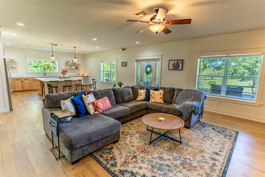 Welcome to your dream barndominium set on +/-2.20 acres. Inside, the updated kitchen features custom white oak cabinets, quartz countertops, open shelving, and abundant storage. A massive island overlooks the living room with built-ins and a cozy wood- burning fireplace. The spacious primary suite is a true sanctuary, offering a luxurious bathroom, and a generous walk-in closet. Step outside to the oversized porch perfect for relaxing. Attached is a 49' x 57' 3-car shop with a bar and outdoor kitchen, elevating your hosting game to the next level. Guests will appreciate the charming guest cottage, and the little ones are sure to love the playhouse. With three RV hookups, a pad site equipped with a septic pumping station and electrical, this property is as practical as it is picturesque. More or less acreage is available, call for more information!!