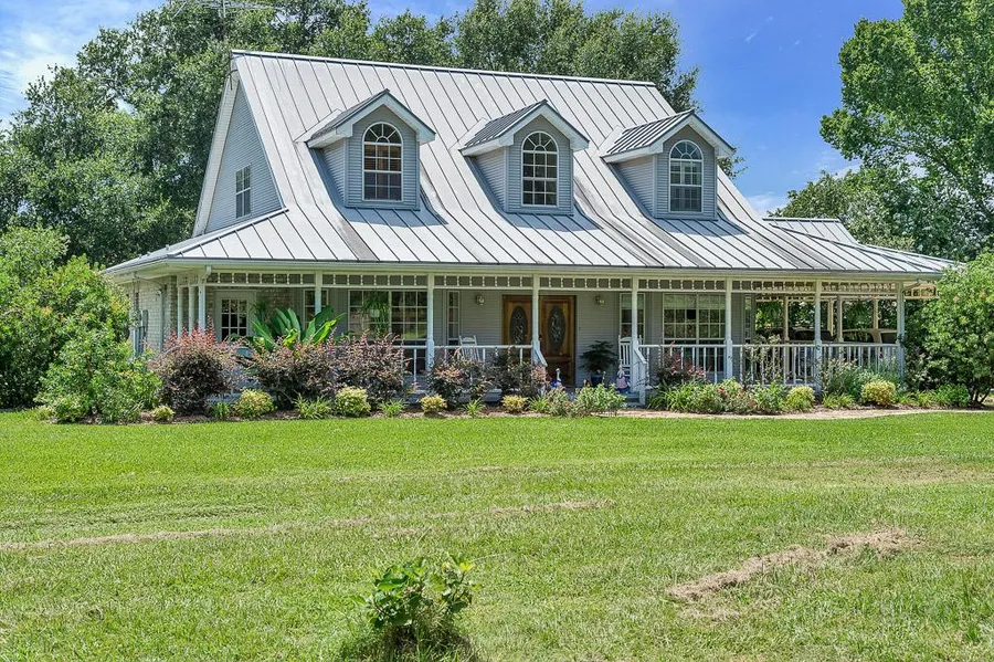 Stunning, country home on 10 manicured acres in Austin county! Meticulously cared-for property with 2-story home, separate office/cottage and 3-bay metal shop building with overhang. This home features wrap-around porches on 3-sides, a covered 2-car carport plus stamped-concrete patio, circular drive, walkway to office, detailed landscaping, abundant oaks, pecans and cedar trees, stocked fishing pond with pier, electric, rod-iron entry gate, perimeter fencing, and wooden-privacy fencing around the front for ultimate seclusion and privacy! This beautiful home features 3 bedrooms, 2 1/2 baths, separate study/office, formal dining, breakfast room, large living area with stone fireplace, and updated/remodeled kitchen.