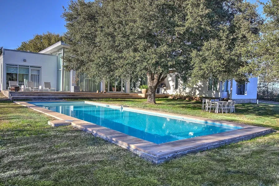 Stylish, sophisticated modern design by StudioMET architects in the country? Yup, it's true. This three bedroom, three bathroom with a study, office nook and sparkling pool is situated on a five acre tract of land between Bellville and Bleiberville. Upon entering the home you will find soaring ceilings and walls of floor to ceiling glass that not only allows one to take in serene views, but also amazing natural light that fills the clean open concept home. Also of note and not to be missed is the metal barn complete with concrete floor and three horse stables. With the property's close proximity to Round Top, Brenham and Bellville it has been recently used as an income producing property.