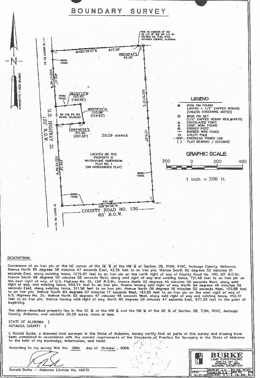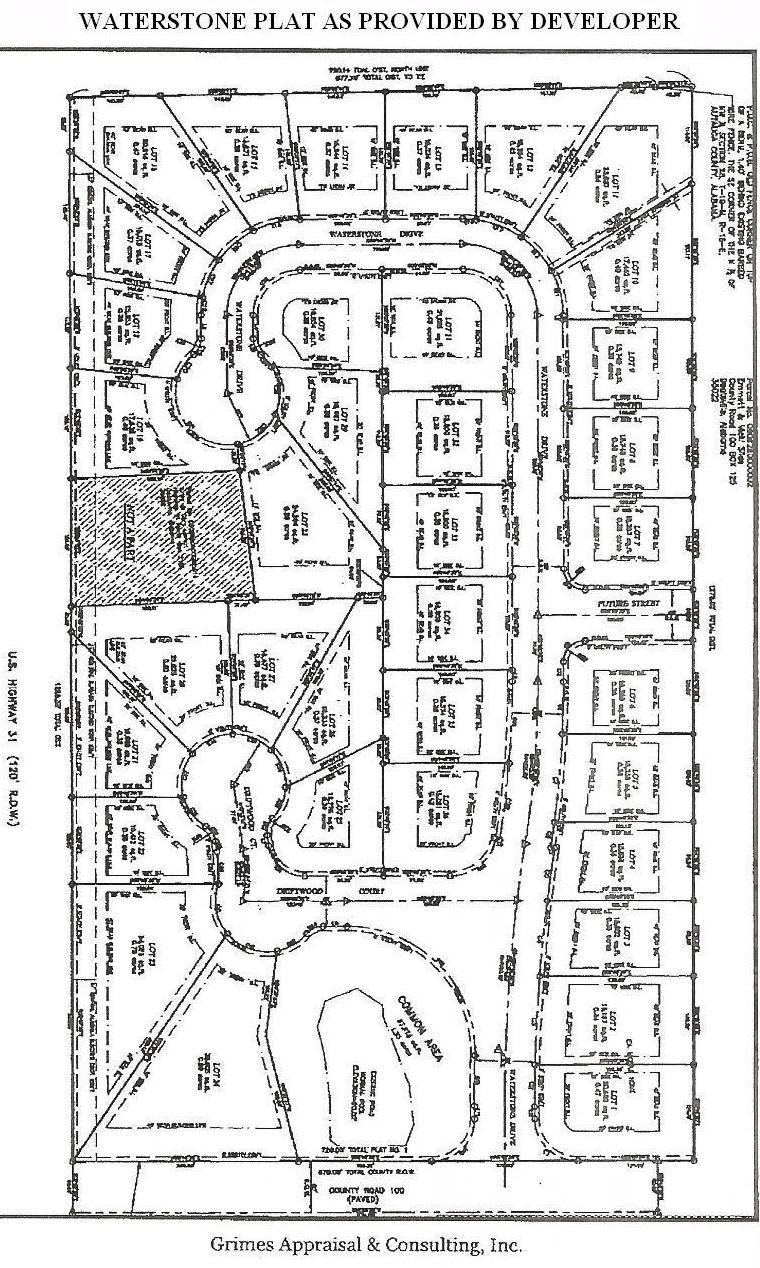 BANK FORECLOSURE! PRICE REDUCED TO $699,000. WATERSTONE SUBDIVISION IN PRATTVILLE/PINE LEVEL COMMUNITY, AUTAUGA COUNTY. It is located in a high growth area and only minutes from Interstate 65. This 36 lot subdivision offers great level building lots. High exposure is offered with frontage on State Highway 31 and County Road 100. There is also a new school within walking distance. An attractive entrance, street lighting, curbs, storm drainage and undergound utilities are in placed. ACT NOW SO YOU CAN WRITE YOUR OWN COVENANT AND RESTRICTIONS.