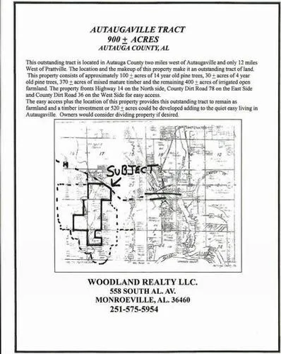 The location and the makeup of this property make it an outstanding tract of land. This property consists of approximately 100 acres of 14 year old pine trees, 30 acres of 4 year old pine trees, 370 acres of mixed mature timber.