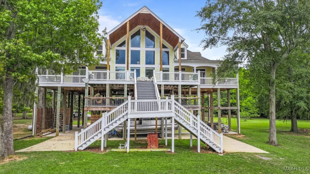 GORGEOUS RIVER FRONT PROPERTY WITH ACREAGE IN PRATTVILLE! Located in the sought-after GATED community of Grandview Harbor, one will find this stunning custom built river front home that is situated in a very private cul-de-sac. The home sits on 11.6 acres and has a long winding driveway that takes you up to the house. Surrounded with amazing water views on all three sides of the home and wooded acreage behind the home will enchant you with its charm. The home boasts 5 bedrooms, 5 bathrooms, a bonus room, vaulted ceilings, a full wrap around porch, a large living room with elegant A frame windows that overlook the river, a large stone fireplace in the living room, 2 additional electric fireplaces, an outdoor elevator, custom plantation shutters, 2 tankless water heaters, wood finished ceilings, stainless steel appliances including a double oven, granite counter tops, custom cabinetry in the kitchen, an open air recreation room below the the main floor of the home, a large workshop attached to the house, a very spacious separate laundry room, a boathouse with 2 slips and a slide for the kids with a green light, a hot tub, and so much more. There is a community boat ramp for easy access too! All furnishings and more can be negotiated! Call today and schedule a showing.