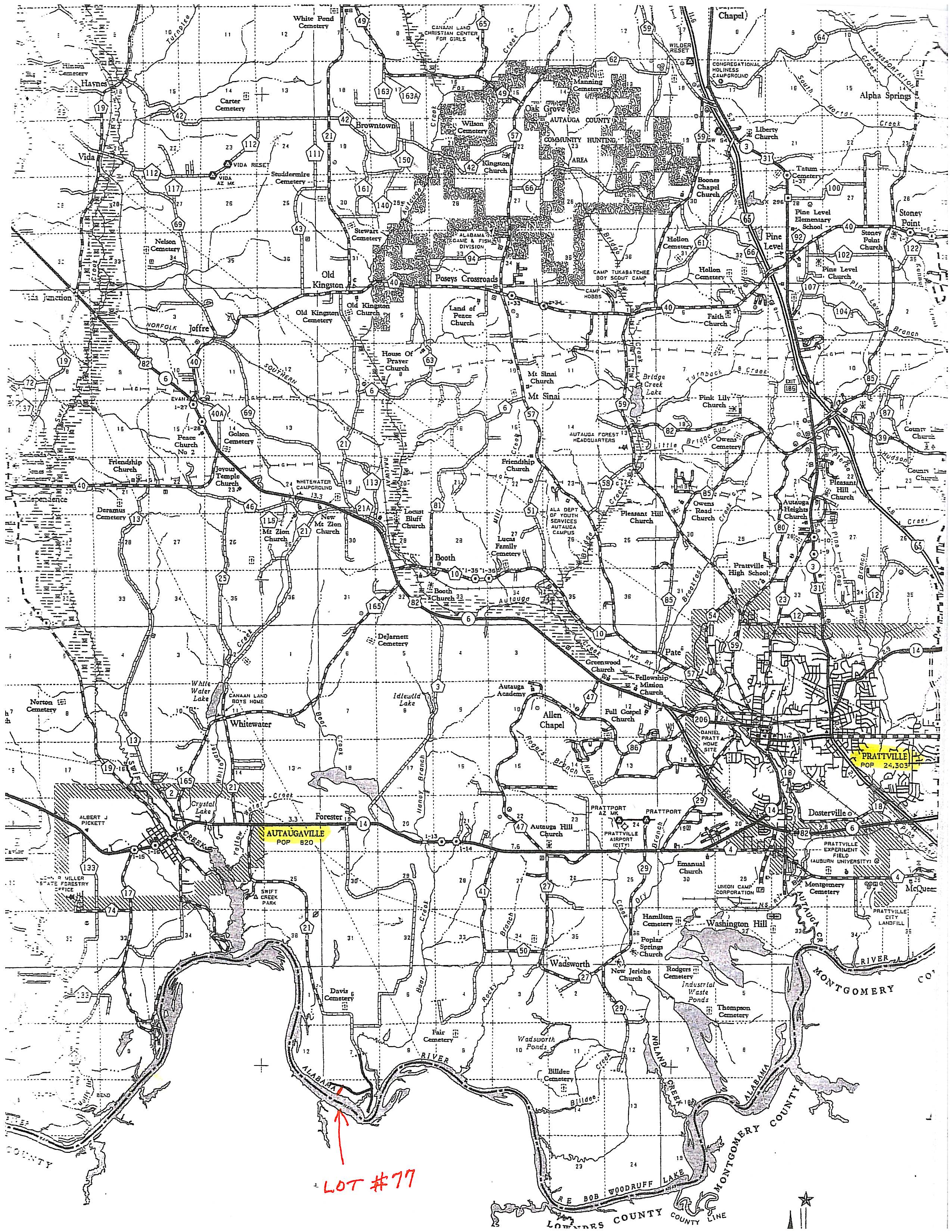 Research Parcel InformationFrom Prattville go west on Alabama State Highway #14 approximately 11 miles to Autauga County Road #21, Turn left (south) go approximately 4.5 miles to intersection wiht County Gravel road. Continue South approximately .5 miles to entrance to Grandview Harbor, go to first right turn, turn right Lot #77 is on the left.