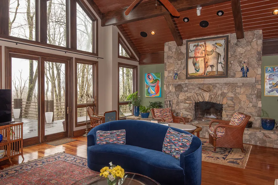 Beautifully appointed one-level living in Linville Ridge. Open living area floor plan affords easy conversation between kitchen, living and dining areas and is conducive to entertaining. The unique stone fireplace with an inviting hearth offers a cozy, intimate setting. The home features beautiful cherry floors through the main living area and master bedroom. Enjoy Grandfather Mountain views from the large covered and uncovered deck with a built-in grill and natural stone fireplace. The beautiful granite countertop encompasses the renovated kitchen with high-end Wolf and Sub-Zero appliances. Features include a surround sound system wired to be able to play your music throughout the house. The master bath features a large glass shower and a beautiful freestanding tub that has stunning views of Grandfather Mountain. Heated tile floors lead into the master suite with a high-end master close...
