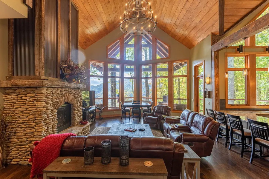 Introducing, The Koronida Lodge at Eagles Nest. Tremendous established rental revenue, well maintained and offered fully furnished. This awe-inspiring mountain retreat is perched at 3,800 feet above sea level on a 1.81-acre plateau framed by mature hardwoods and looking out onto bold mountain views. The home offers 3 BR, 4 BA and 2 bonus rooms in 4,314 sq. ft. of heated space, with 2,257 ft. of deck space. It's infused with rugged stone and cedar siding on the exterior. Step through the front door and be inspired by the cathedral ceilings and floor-to-ceiling windows of the great room. Hardwood floors throughout the main living area are paired with the stacked river rock, flagstone and reclaimed barn wood of the gas fireplace, all framed by Nickle Gap tongue-and-groove white pine. Exquisite granite countertops and top-of-the-line appliances make for an impressive yet comfortable gourmet ...