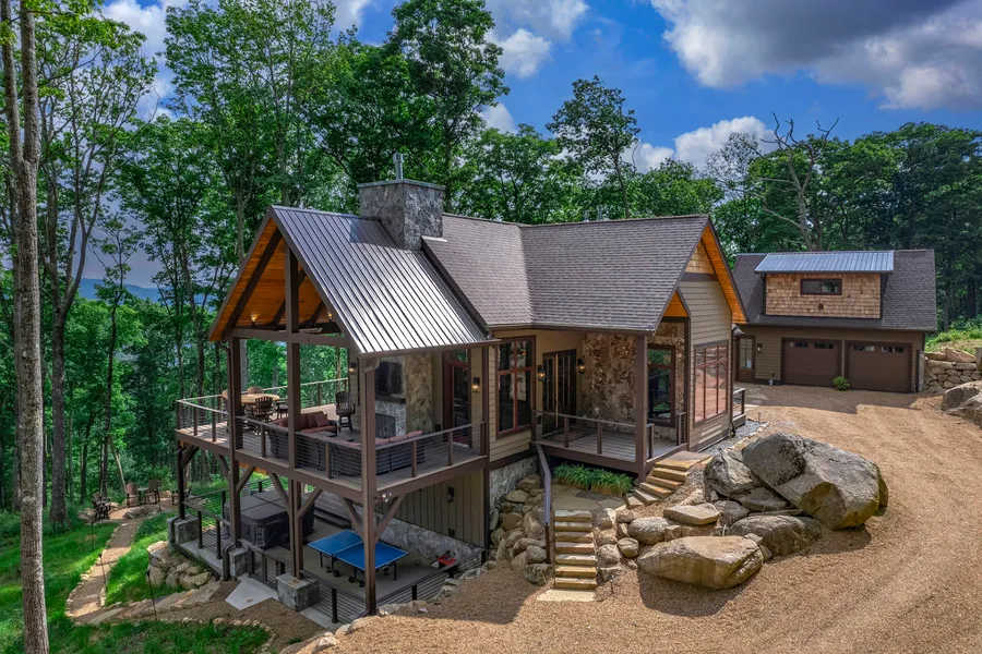 Offered fully furnished in The Lodges at Eagle Nest! Total heated square footage is 3,578 with finished space above garage. The home offers three bedrooms, three baths and two half baths with two bonus sleeping rooms and another full bath. The detached garage offers a 694-heated square-foot guest apartment with its balcony. This tastefully appointed custom lodge is the embodiment of casual rustic elegance and being sold fully furnished. Perched at nearly 4,500 feet of elevation on a 1.11-acre property, this one-of-a-kind home is within easy distance to all the wonderful Great Camp amenities, including the summer concert series and the highly anticipated new restaurant. Massive boulders greet you as you step up to the porch and to the home to find the open floor plan with great room, gourmet kitchen and dining area all free flow. The main living area was designed to provide an intimate, cozy cabin that feels immersed in panoramic long-range mountain views. It features a massive stone fireplace, rich hardwood and rugged beams framing the cathedral ceiling. The kitchen features custom cabinetry, stainless steel appliances with island gas range and ovens, and exquisite marble countertops. The dining area features a long formal dining table with elegant crystal chandelier above. Step out to a covered porch with outdoor fireplace and sitting area. The primary suite is on the main level with stone fireplace and luxurious steam shower. The walkout basement offers a casual den space with full wet bar and bunk room enclosed by massive wooden barn doors. Additional primary suite with stone fireplace and claw foot tub for soaking and a guest bedroom with full bath are on opposite ends of the space. Walk out to the downstairs deck to find an oversized hot tub, dining area and ping pong table. The detached garage features a full bar for football and entertaining as well as a single car and ATV space, and guest apartment above with full kitchen, bath and balcony. Call for a tour.