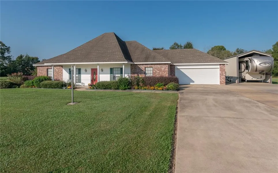 Eleven year old custom built Brick home in great condition. Property features over 1,800 hsf, 3 large bedrooms with 2 full baths, split floor plan and open living / dining room. Exterior has .76 acre lot, tons of landscaping, covered front porch, large covered back patio, 18 x 20 metal shed (easily converted to outdoor kitchen and also a 14 x 38 RV Shed or Shop. Home is just outside City limits near Hospital and is located on a culdesac street.