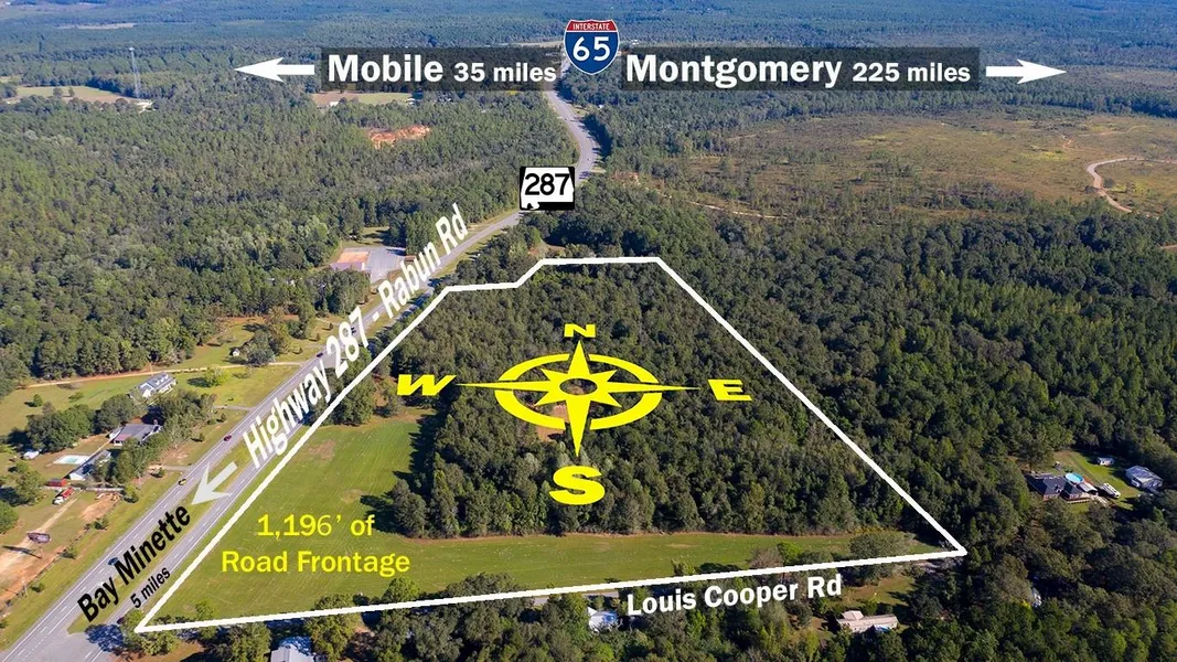 Research Parcel InformationFrom Atmore, AL/FL line: Head northwest on S Main St. Turn left onto W Craig St. Turn right onto Highland Ave. Turn left onto US-31 S/W Nashville Ave. Continue to follow US-31 S. Turn right onto Co Rd 47. Turn right onto Co Rd 61. Turn left onto Co Rd 47. Turn left to merge onto I-65 S. Merge onto I-65 S. Take exit 37 for AL-287 toward Bay Minette/Rabun. Turn left onto AL-287 S/Rabun Rd. 49453 Rabun Rd, Bay Minette, AL 36507. Property is across the street.