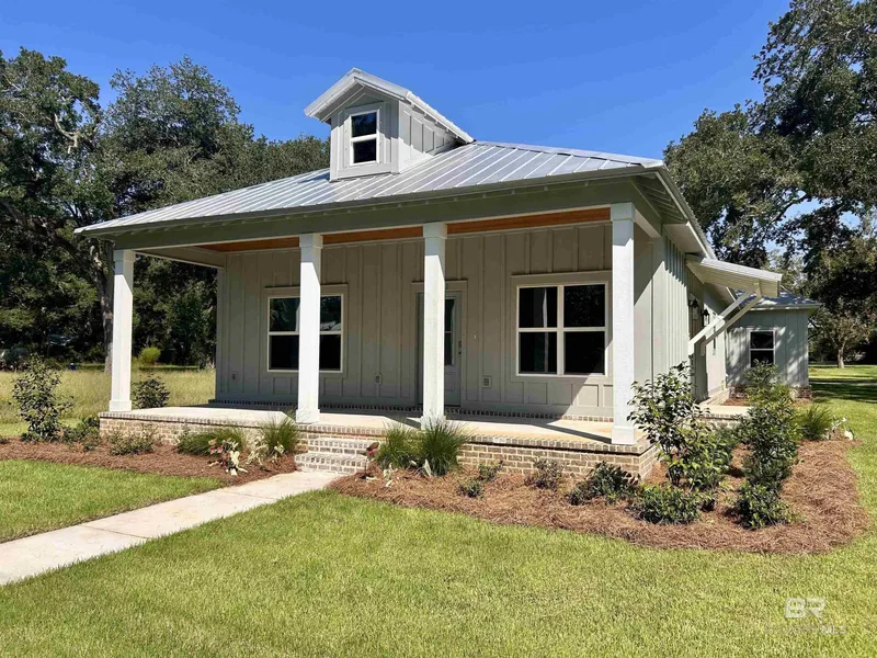 This charming cottage-style home exudes warmth and character. Its inviting facade features concrete board and batten with a brick skirt, complemented by a metal roof adorned with matching gable. A welcoming front porch, complete with stained wood porch ceiling invites you to enjoy the peaceful surroundings. The inviting interior offers all of the most modern amenities that you would expect in a new home, hand-carved wood flooring throughout main living area, hallway, and primary bedroom, plenty of natural light, crown moulding throughout, 5 1/2” baseboard trim, cased windows, and upgraded lighting package.The kitchen, the heart of the home, features a farmhouse sink, quartz counter tops, painted cabinets, large pantry, and GE Cafe Appliances (white with gold accents).Thoughtful indoor-outdoor connectivity expands your entertaining choices, Gold Fortified Certified, Tankless Water Heater, upgraded landscape package, rear entry double garage, and much more included in this rare opportunity for new construction in Magnolia Springs. Buyer to verify all information during due diligence.