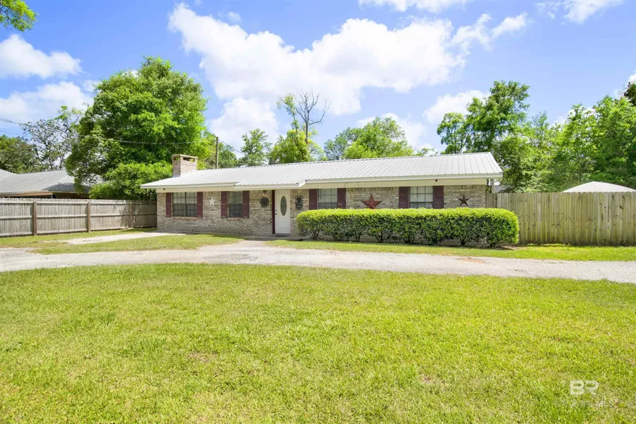 Discover the charm of this delightful cottage-style brick home located in the heart of Foley, AL. This residence is updated with a durable metal roof. Sits on a large lot with a fenced-in backyard, perfect for outdoor activities. The circular driveway adds convenience and curb appeal. Inside, the living area features a lovely painted brick wall with a cozy fireplace, creating a warm and inviting atmosphere. Enjoy the outdoors on the spacious covered back porch, ideal for relaxation and entertaining. Situated in a well-established neighborhood with no HOA, this home offers affordability and a prime location. This home is walking distance to local parks and to Ivan Jones Stadium. Just blocks to downtown Foley which is up and coming with dining, shopping and spectacular events! This location is outstanding! Buyer to verify all information during due diligence.