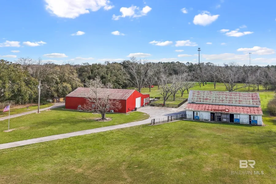 Priced to sell/move! 10 Beautiful Acres in Baldwin County – A Rare Gem!Location, Location, Location! This unique 9.8-acre property offers the perfect blend of seclusion and convenience. Located just minutes from the vibrant heart of Foley, Alabama, and a short drive to Alabama's beautiful beaches, this peaceful oasis presents endless possibilities. Whether you're dreaming of building your forever home, creating a family estate, or starting a farm, this property is your canvas. Property Features: Location: Nestled on the Foley/Summerdale line in North Foley, this property offers both privacy and proximity to local amenities. Size: 9.8 acres of prime land with endless potential. Newly Renovated Barndominium: Living Space: 1,500 sq. ft. of beautifully renovated living space. Shop Area: Spacious 75x75 ft. shop included, ideal for any project or business. Design: Modern, rustic charm blends seamlessly with updated, high-end finishes. Recent Upgrades & Features: Energy Efficiency: Spray foam insulation in the ceiling and exterior walls for optimal temperature control. Exterior: New metal roof and siding (2023) for durability and style. Tornado-Safe Room: Built with 12" poured concrete block walls and a concrete roof. Utilities: New underground electric, water, and sewer systems installed in 2022. Additional Highlights:Sunroom: A heated and cooled sunroom off the southwest corner, perfect for year-round enjoyment. Kitchen: Fully equipped with a dishwasher, double oven range, and refrigerator. Sunroom Amenities: Refrigerator, beverage cooler, and microwave for added convenience. Well Water: Private well for water supply. This property is an absolute dream for anyone seeking a tranquil retreat with all the comforts of modern living. Whether you're planning to build, farm, or simply escape to your own private paradise, the possibilities are endless. Don't Miss Out! Opportunities like this are endless—build, farm, or simply enjoyyour very own private paradise! Buyer to verify all i