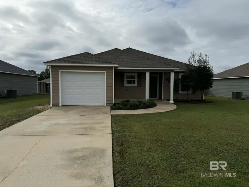 Charming cottage tucked away on a cul-de-sac! This three-bedroom, two-bath home with a single-car garage offers a peaceful pond view from the covered back patio. Inside, enjoy high ceilings in the living area and an open, split floor plan designed for both space and functionality. Conveniently located just a short drive from OWA, Gulf Shores, and Orange Beach, this home combines comfort and convenience in the heart of Foley. Buyer to verify all information during due diligence.