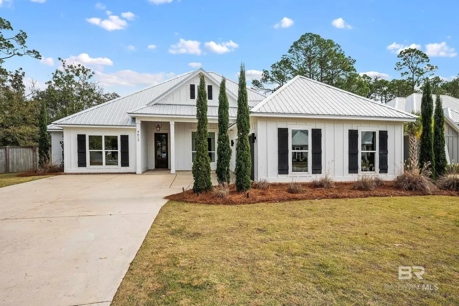 Custom limitless home in Shore Acres. This 4 bedroom 3-bathroom with a bonus room is the perfect floorplan to meet all your needs. This coastal home is both functional and spacious, featuring a split bedroom plan, dining room, 10-9 ft CEILINGS, mudroom, large foyer, and dual entry bathrooms. A modern coastal look follows throughout the home with its designer light fixtures, custom bead blinds, manufactured hardwood flooring, wood look beams, and stucco gas fireplace. The home screams custom including white quartz counter tops, custom tile throughout all bathrooms and utility room, crown molding, and cased windows. The gourmet kitchen is a dream with its waterfall white quartz kitchen island, GAS RANGE with custom stucco vent hood, pot filler, built in wine frig, soft closed cabinets to the ceiling with under mounted lighting, and quartz backsplash. The elegant primary bathroom includes separate walk-in closets, double vanities, sleek free-standing tub, with separate tile shower. Enjoy your morning coffee while sitting on the back porch, with 6ft privacy fence, and only ONE NEIGHBOR. The landscaping has been upgraded and includes an irrigation system. Homeowner’s insurance will be discounted due to the house being built to the Gold Fortified Standard. No flood insurance required, home is in flood zone X. Shore Acres is centrally located close to parks, library, schools, restaurants, the Rec Center, and less than 3 MILES to the Gulf of Mexico. Do not miss out on this chance to own 1 out of 17 coastal homes in one of the most unique neighborhoods in Orange Beach Alabama. Living Room TV, Kitchen Frig, Washer, and Dryer Convey. ***OPEN HOUSE Saturday January 24th 11AM -2PM*** Buyer to verify all information during due diligence.