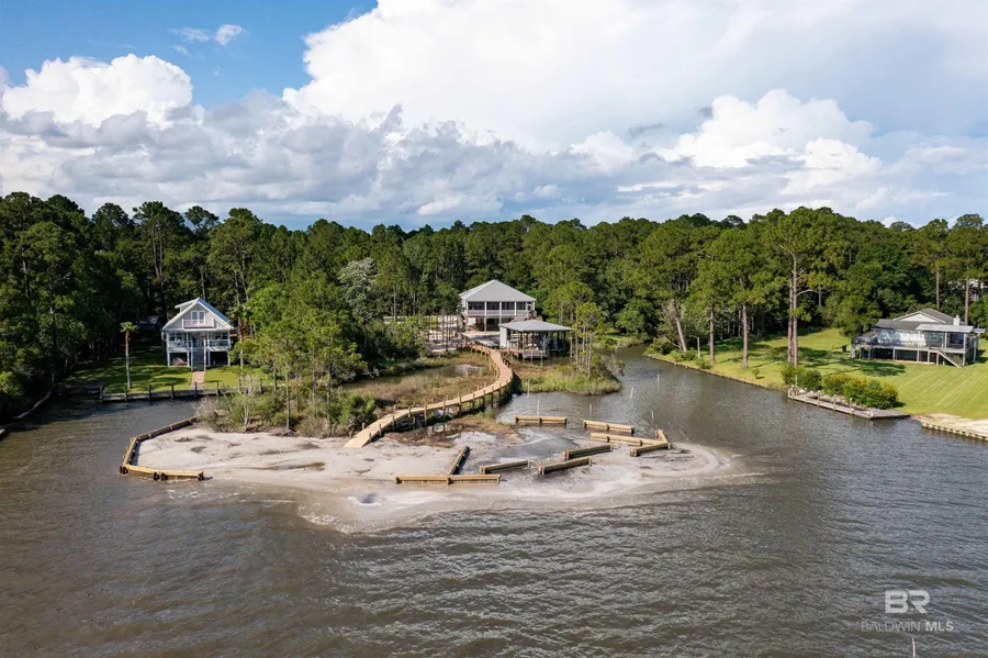Discover the rare opportunity to own a two-lot waterfront property with approximately 200 feet of serene Wolf Bay frontage, including a private beach. Located in Elberta, this well-maintained piling built home offers 4 bedrooms, 2 full baths, and elevated coastal living with panoramic water views from the kitchen, living room, and primary suite. Step inside to find upgraded wood flooring, 10’ ceilings, 8’ doors, and custom trim throughout. The kitchen features stainless steel appliances, gas range, neutral granite countertops, painted shaker-style cabinets, a walk-in pantry, breakfast bar, and under-cabinet lighting. The bathrooms are finished with natural marble countertops, and the primary suite includes 2 closets, dual vanities, a soaker tub, and walk-in shower. Enjoy modern comforts like a gas log fireplace, tankless water heater, whole-house vacuum, impact windows, and extra insulation. Wall-mounted TVs are included in all bedrooms, the great room, and on the waterside deck. Furniture—indoor and out—conveys with the home. Outside, a screened porch leads to a grilling deck with a built-in propane connection and included grill. The fenced backyard and under-home storage area offer convenience and functionality, including space for 5 vehicles and an outdoor hot/cold shower. Boating enthusiasts will appreciate two boathouses (single lift and 2 boat slips) and water/power at the dock with a fridge/freezer already installed. The second boathouse is under construction with an expected completion on or before end of October 2025. No POA dues and a low-maintenance lot make this a smart investment or dream retreat. Schedule your private showing of this waterfront gem today! Buyer to verify all information during due diligence.