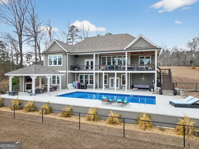 Welcome to this stunning lakefront home in the sought-after Club at Lake Sinclair. This custom-built residence, only five years old, offers 5 bedrooms and 3.5 baths with a thoughtful blend of modern luxury and functional design. The main living area features a striking coffered ceiling and an industrial farmhouse aesthetic that blends rustic charm with contemporary style. At the heart of the home is the chef's kitchen, complete with custom cabinetry, stainless steel appliances, pot filler, expansive island, and a dedicated coffee bar-perfect for everyday living and entertaining. Also on the main floor is an office/flex space for convenient use. The primary suite is a true retreat with a spa-inspired wet room featuring a soaking tub, detailed tilework, and a large walk-in closet. The open, flexible floor plan provides generous living space both upstairs and down. The finished lower level is designed for entertaining, featuring a spacious recreation room, wet bar, and flex space currently used as a workout room. There's two additional bedrooms offering ideal accommodations for guests or extended family. Beautiful large bathroom with soaking tub. Stained concrete flooring adds a modern, urban touch. Outdoor living is exceptional with a sparkling swimming pool featuring a 9-foot depth, a large covered porch, and a beautifully designed pavilion overlooking the pool with sweeping lake views and an outdoor fireplace-ideal for year-round enjoyment. A new single-stall dock with boathouse providing easy access to boating, fishing, and lake life. This exceptional Lake Sinclair home offers luxury, comfort, and an unmatched waterfront lifestyle.