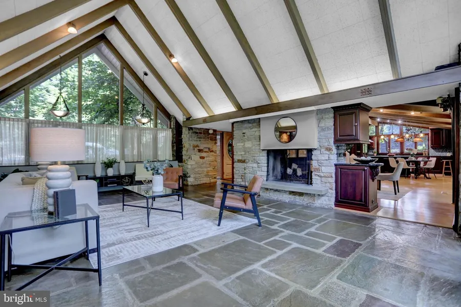 This custom Mid-Century modern marvel seamlessly blends mid-century design and luxury with functionality, offering an ideal living space for those who appreciate style and comfort. An exquisite stained glass designed by an artist from the Adirondacks, sets the stage as you walk -in for this custom home and all of its wonder. Designed by architects from Smith and Vale in the style of Frank Lloyd Wright, the living room is lined with sweeping windows, doors, vaulted and red wood beamed ceilings, with plenty of space for relaxation and entertaining, with custom built-in shelving and double-sided fireplace and a powder room. The open concept living and dining area is both spacious and warm and connects seamlessly into the kitchen. A chef's dream, the custom kitchen is equipped with all of the "bells and whistles" including top-of-the-line Kenmore Pro and Kitchen Aid stainless steel appliances, large island with cooktop, double wall ovens, a bread warmer, detachable table, wet bar, coffee bar, and smartly design storage perfect for culinary enthusiasts. Built-in cabinets display your favorite treasures and keepsakes lining the kitchen and dining area. The all-season sunroom off of the kitchen bathes the space with warmth and light and is complete with built-in cabinetry. The primary suite is outfitted with custom closets with private access to the courtyard with bucolic views. The primary suite is complete with a luxurious ensuite bathroom with soaking tub, separate shower, and numerous elegant touches. Enjoy custom stained glass window and door features, slate stone work, heated floors, and millwork throughout the home. On the other wing of the home, three additional spacious bedrooms with large closets and pocket doors provide comfort and efficiency through smart design, as well as two full bathrooms and an office nook with a stunning mahogany mantel. The main floor laundry has plenty of additional storage and convenience to the living area. The attached three car garage with EV 220 charger and circular driveway provides plenty of parking for multiple vehicles and additional storage. The finished basement, perfect as an additional office or recreation space, has its own bathroom with large stall shower, a large cedar closet, and a storage room. The 1.43 acre grounds includes a large gazebo, cozy flagstone courtyard spaces, sculpture, and an out building/storage shed. Over $150,000+ of investments in the home are passed on to the new owner of this gem, with a new roof in 2024 (not A-frame), new furnace and HVAC system in 2023. Don't miss the opportunity to own this exquisite home. Located in the desirable area of Pikesville, MD, this home is close to top-rated schools (The Park School and Gilman schools right nearby) country clubs (Suburban Club and The Woodholme), shopping and dining destinations at Quarry Lake, commuter routes and recreational facilities. Near the Cylburn Arboretum and numerous parks. Property is sold with an additional, buildable 1.25 acre adjacent lot (2903 Old Court Rd).