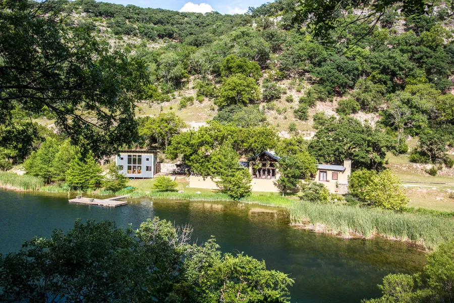 the original 100 year old adobe one room cabin. Rustic, charming, extremely unique. Concrete and mission tile floors. Compound sleeps 24 if all doubles and queens are filled. Three fire places in main house. Main House ( 2/2 with sleeping loft, great room, inside porch and 1100 feet of outside deck relax and enjoy the view of the lake and limestone bluffs)) and Guest House sit on a small rise above the spring-fed lake. The two houses are connected by a limestone patio with large outdoor fireplace and a small building housing the kitchen/casita, washer and dryer, and additional pumphouse.