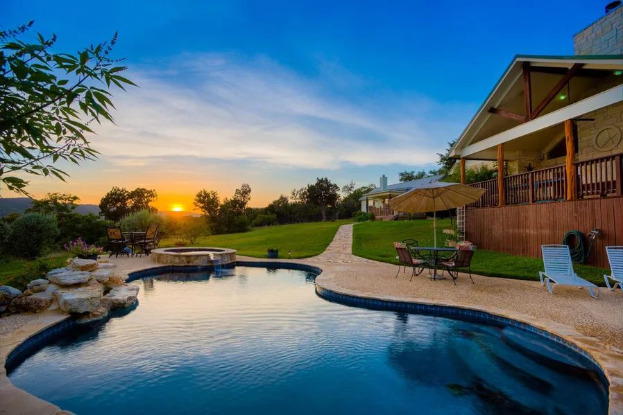 Hill Country style home with metal roof, approximately 1800 sq ft home built in 2003 with gourmet kitchen including gas stove, wine cooler, granite counter tops and more.....2 bedroom, 1 bathroom with walk-in shower and a half bath, 2 fireplaces, utility room, covered deck overlooking the pool, and an attached covered 2 car carport with enclosed workshop.