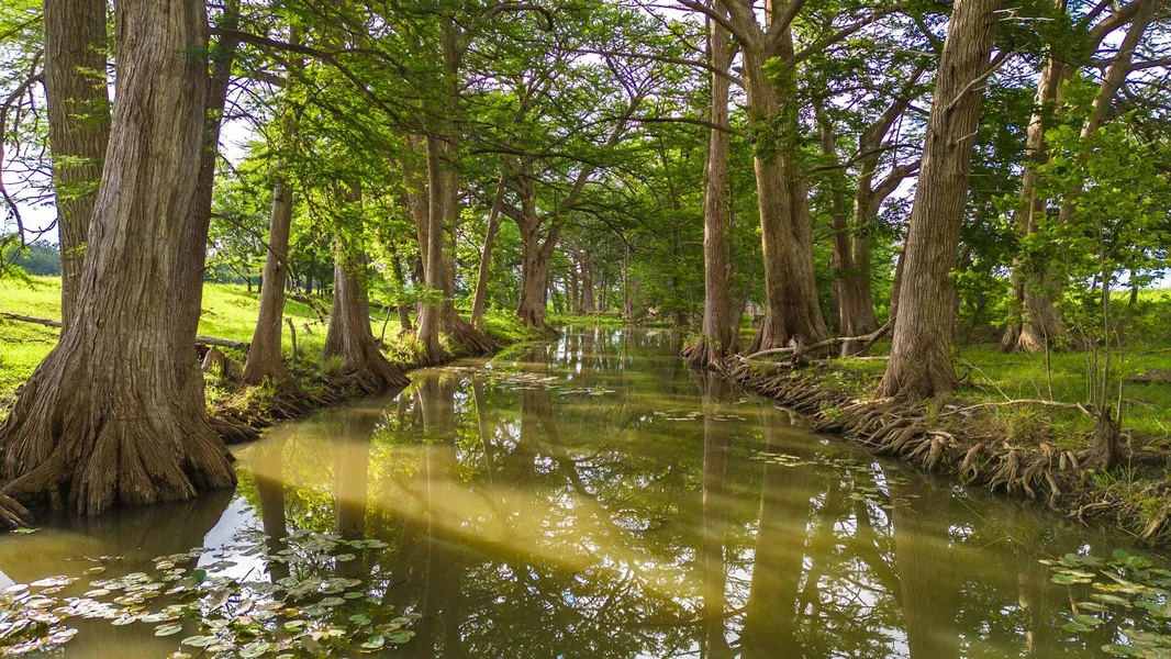 the Sabinal River, winding beneath a canopy of heritage oak trees, and passing by the historic