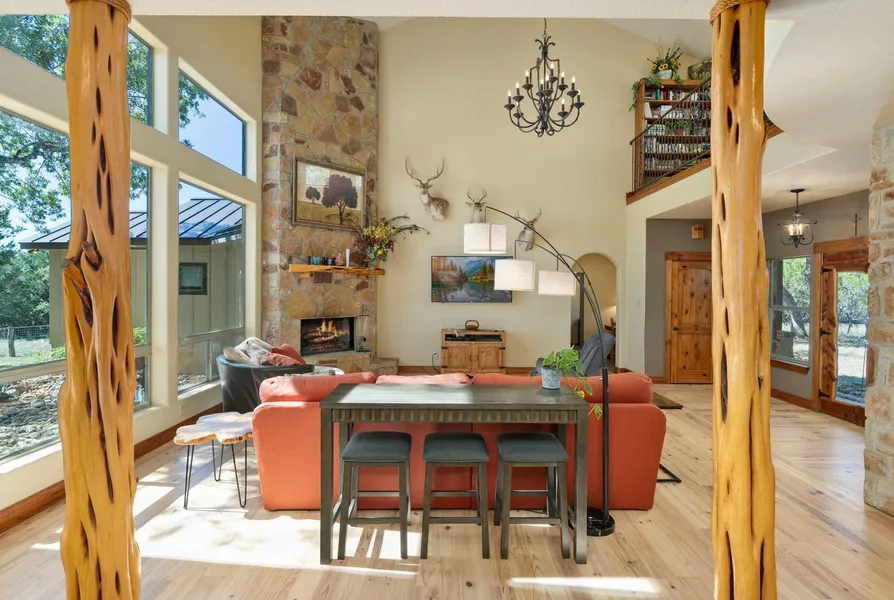 Welcome home to this stunning +/- 10-acre Texas-style estate located in the heart of the Texas Hill Country! This custom home exudes sophistication and craftsmanship, with a blend of natural elements and enduring design. Inside, you'll find beautiful natural wood flooring, ample natural light from large windows, and meticulous attention to detail, from hand-crafted cabinetry to a stunning stone fireplace. The home offers three secondary bedrooms and a dynamic game room for entertainment. The primary suite is luxurious, with private access to an enclosed patio and a spa-like en suite bathroom. Outdoors, you'll find a 3-stall barn with a tack room and corral for equestrian enthusiasts along with RV-covered parking. Host gatherings in style with an outdoor kitchen equipped with granite countertops, a sink, smoker, grill, and side burners. This property offers the perfect outdoor retreat wit...