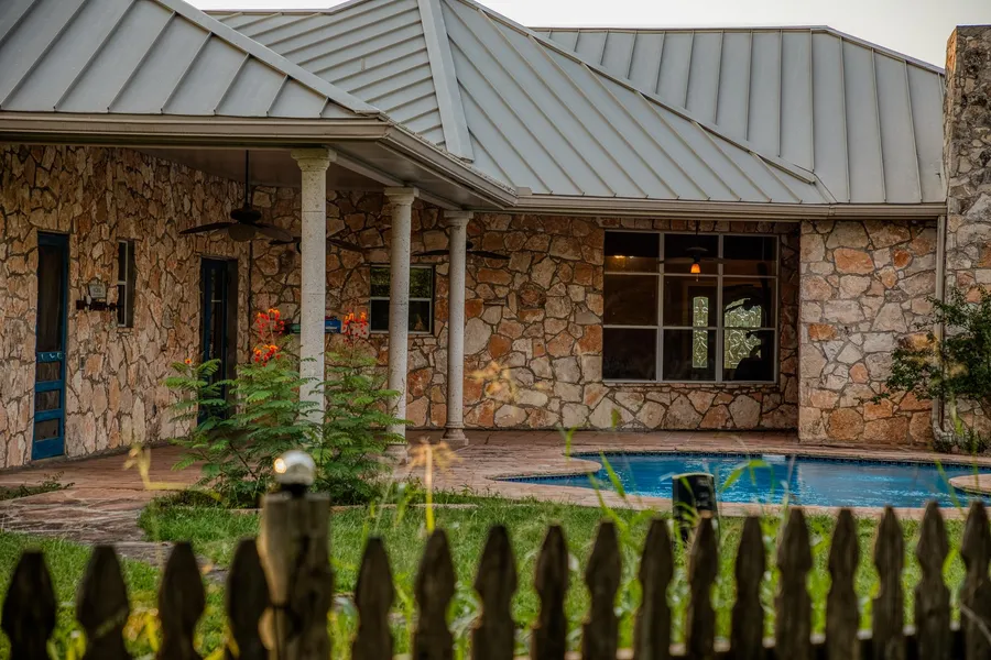 ACCESS. Paved FM road frontage makes this property easy to access in all weather conditions. Its a premium feature that is definitely desirable and adds to the better infrastructure. As you approach the gated entrance, the anticipation grows as you begin to drive under the shady canopies with sunlight peeking through the leaves. The atmosphere envelops you and sets the tone for the lifestyle that awaits just beyond. The winding gravel driveway leading up to the propertys improvements transitions into a smooth concrete pathway beyond the yards fence, creating an aesthetically pleasing feature. The attention to detail showcases a professional approach to both functionality and design ensuring a welcoming and polished entrance to the property. The improved access allows you to enter the home without tracking in dirt or mud, leaving it outside where it belongs!