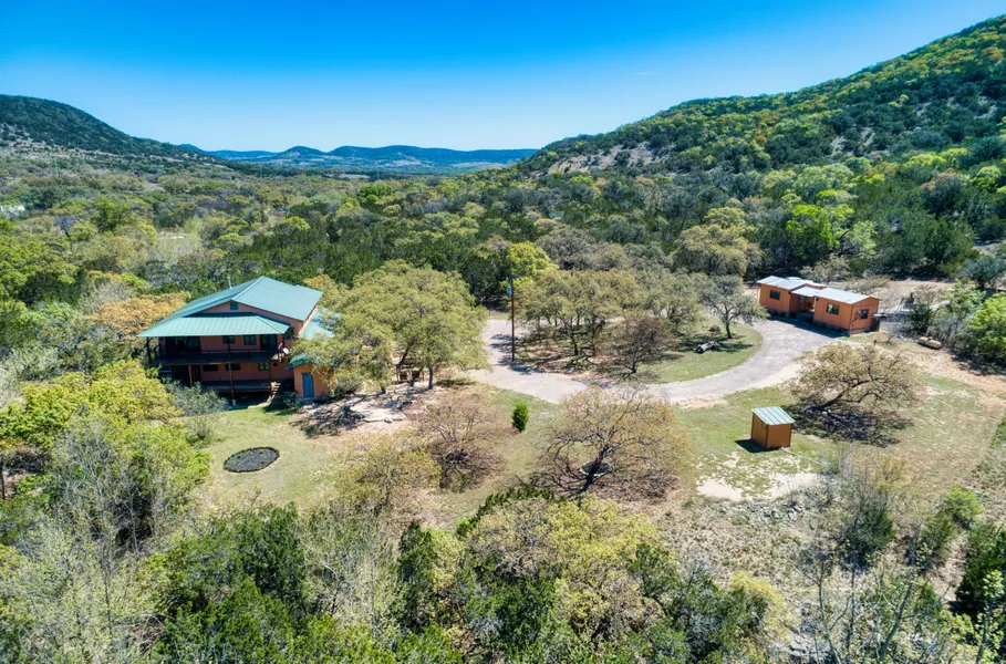 Scenic 20 Acre Retreat at the end of Lost Lane off Hwy 470 between Tarpley & Utopia. Sprawling 3 bed + Sleeping loft Stucco home w/metal roof boasts covered decks & lower level screened porch overlooking Brushy Hollow Creek. Upper deck off the massive master bedroom has outstanding hill country views. Third bedroom in front of house could be a study. Open living, dining and kitchen areas are perfect for entertaining with beautiful yellow pine flooring. Sleeping loft area upstairs with cedar stairs and railing. Unique guest house has bed, bath & Kitchen connected by boardwalk leading to private outdoor shower (really cute). Grassy & flat land along the creek surrounded by huge blue oaks, sycamore, and madrone trees. Hike up the hill for more views. SEE VIRTUAL TOUR!