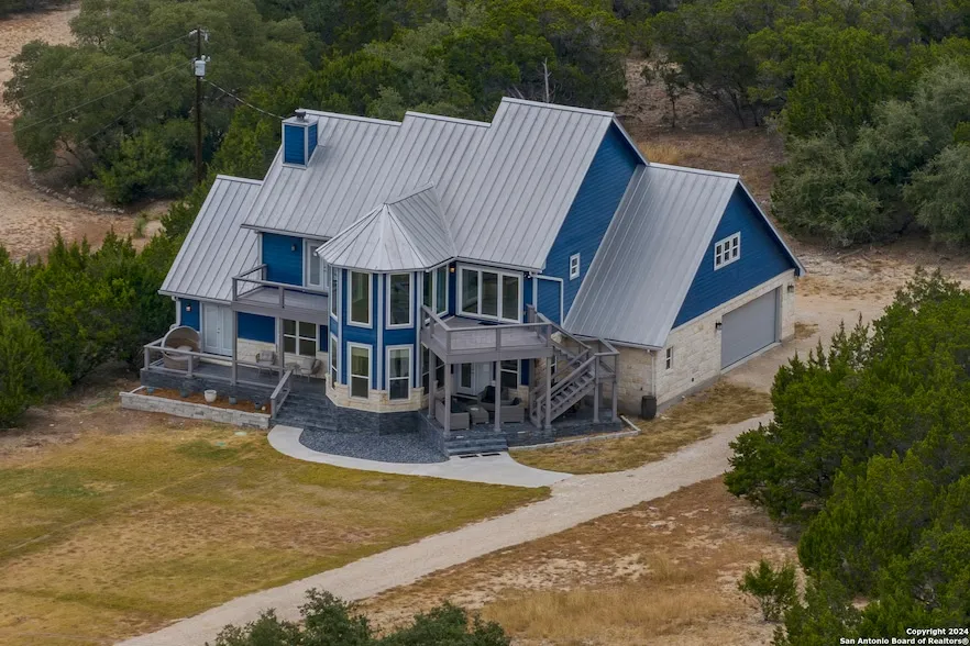 Just miles away from Medina Lake, this stunning 4-bedroom, 2.5-bathroom home, boasting 2875 sqft of modern luxury. Built in 2020, this home offers a front porch overlooking a peaceful greenbelt. Upon entering, you're greeted with high ceilings and abundant natural light, leading to a unique pentagon-shaped dining room with dramatic floor-to-ceiling windows. The open-concept eat-in kitchen features sleek white cabinetry, stainless steel appliances, and elegant granite countertops. The spacious master suite offers French doors that open to a private balcony, along with a luxurious ensuite bathroom complete with two large vanities, granite countertops, oak cabinets, and a walk-in shower. Additional highlights include multiple balconies and a thoughtfully tucked-away staircase. This home is a perfect blend of elegance and comfort! 4th bedroom is currently used as a Gym. This property is USDA eligible, which means you can purchase with no money down and no mortgage insurance."
