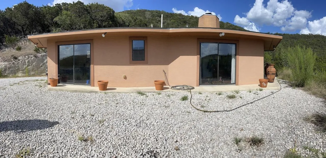 Unique Mountain Modern home with amazing Hill Country views, and incredible privacy. This 9.66 ac property has a private road from Spring Rd up to the home, the property lines run all the way to S Goat Ridge Rd where there is another amazing view. Old Growth Cedar trees and too many Oak Trees to count. Miles long views from the many windows/glass doors. Stargaze from the gazebo after the amazing sunsets. The homesite is carved out of the side of the mountain so no North winds to hit directly. Southern/Western views from the bedrooms and living area never disappoint. The house has stained concrete floors that help with cooling. Open living room and dining area provides for cozy places to rest. A wood burning fireplace heats the room nicely on cold days, and the two large sliding glass doors provide amazing views of the stunning Hill Country scenery. The galley kitchen is a walk through with a generous number of cabinets, a pantry, and storage closet. The main bedroom has an ensuite bath with separate vanities. A generous linen/storage closet is just across the short hall to the reach in closet. The main bedroom is light and airy with a sliding glass door onto the back porch, giving amazing views all day and night. The second bedroom is on the other side of the home, sharing a hallway with the second full bath and spacious laundry room. Many storage options in this home. Car port spans to another storage area perfect for the minimal lawn care equipment needed. The home is xeriscaped with drought tolerant plants and many Natives. This home will be easy to make your own. limited restrictions, no HOA Call Suzy Sims (210)240-8523 for appointment