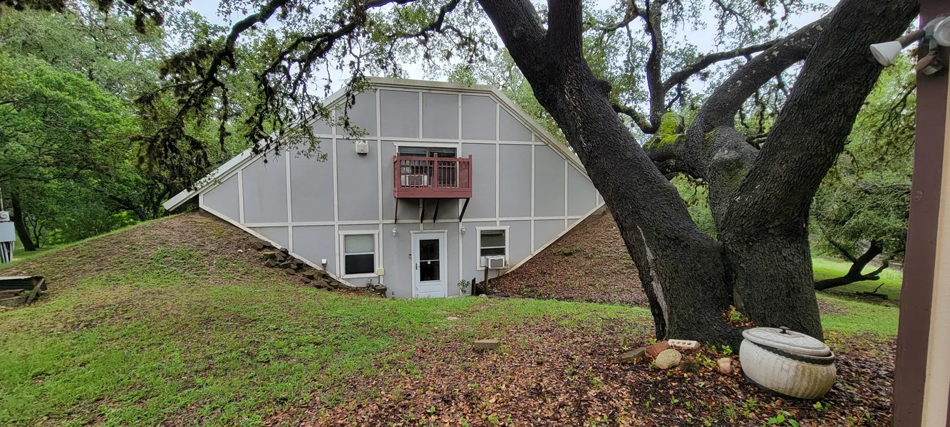 This is gorgeous acreage with multiple century oaks which meet the Red Bluff Creek Frontage. The home is a berm home built in 1988 by an Engineer for his PhD paper of which the current owner has the plans and notes showing how the home was built. Since it is nestled into the hillside the home uses very little electric to heat or cool this home. The owner had electric bills to show his monthly outlay - most of which are $50 or under. This home has its own septic system and water well. The property is surrounded by open land and beautiful views. The Ranch across the fence is privately owned so there are no neighbors. The property is close to Bandera, Pipe Creek, Helotes, shopping, restaurants and entertainment.