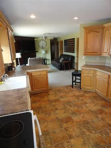 is functional and comfortable. This was built for the U.P. winters with snow load trusses and new wood stove insert in the living room.