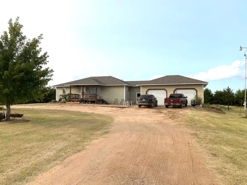 Country living on 2.8 acres! This newer home with 3 bedrooms, 2 baths, and a 2-car attached garage is located just one mile off of US HWY 160 just northeast of Sharon, KS. The front door takes you into an open-concept main living area that includes a living room, dining room, and kitchen. The Kitchen is huge with tons of cabinet space, beautiful hardwood floors, and an eating bar. Right off the kitchen there is a laundry room with covered outside access to the garage, the laundry room has a shower, huge closet, and a folding cabinet. The master bedroom has a large closet and built in desk area. A second bedroom on the main floor has multiples windows offering great light and a large closet. The full, finished basement has a large family room, a large bedroom with a walk-in closet, full bath, and a bonus room that could be a forth bedroom or storage. This home also has a newer roof and HVAC system, a large circle drive, tree shelter belt on the north edge of property, great internet service, and a covered front porch. There is also a large area to the east of the home that would be great for additional buildings.