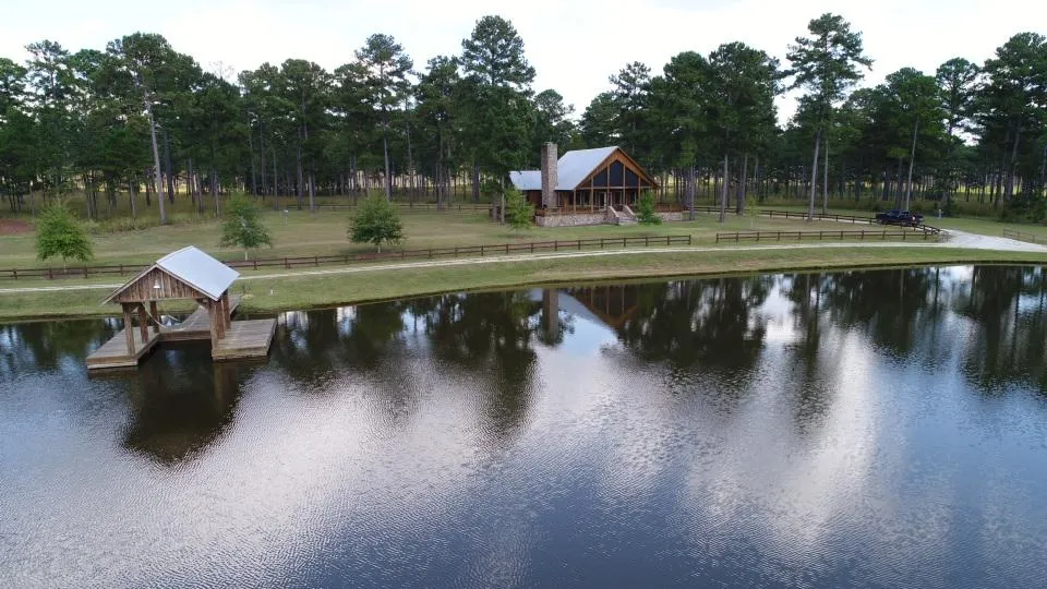 Lodges: Has two pine, cedar, and cypress lodges that are stunning that overlook the 13-acre lake. They are 1800 sq.ft. and 2200 sq.ft. They are expertly built with open floor plans and plenty of bedrooms